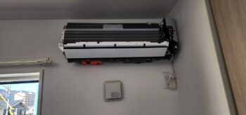 これの原因は、ハウスメーカーにてエアコン穴が開けてあった状態ですが、穴位置が真ん中に寄りすぎていて寸法上取付出来ないとのことで、無理やり窓上に取り付けて行ったらしい(-_-;)まぁ分からなくはないけど・・・